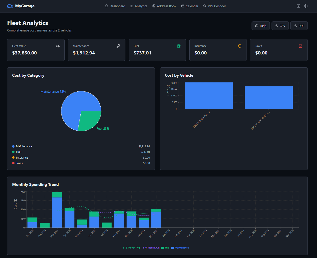 Fleet analytics for spending trends across all vehicles. Individual dashboards show cost breakdown per car with charts.