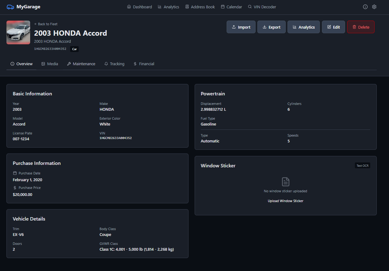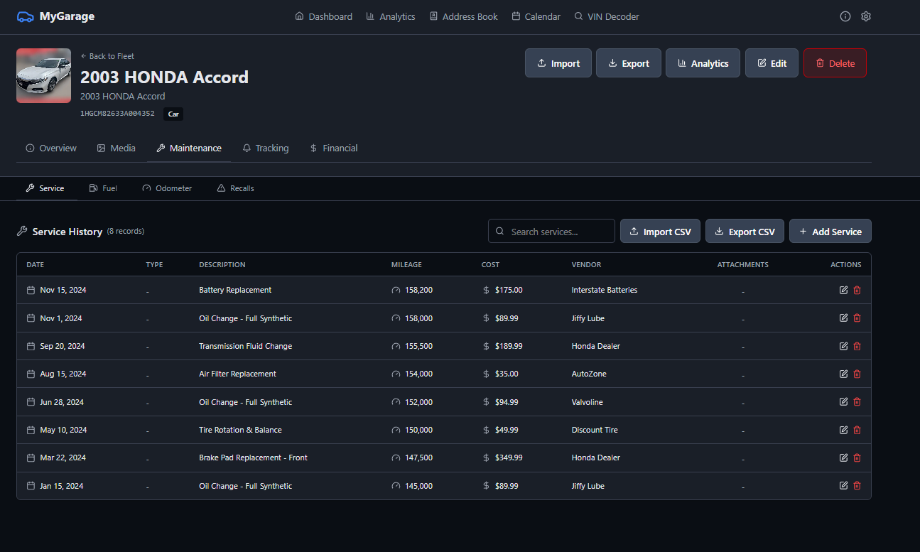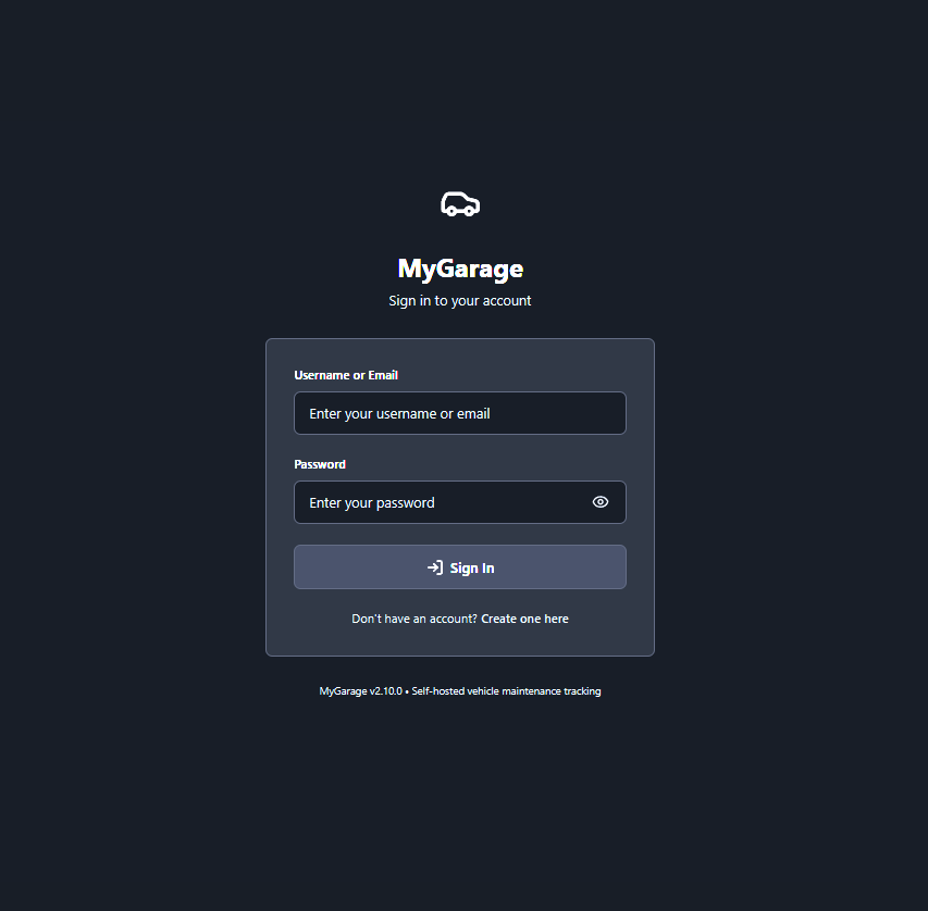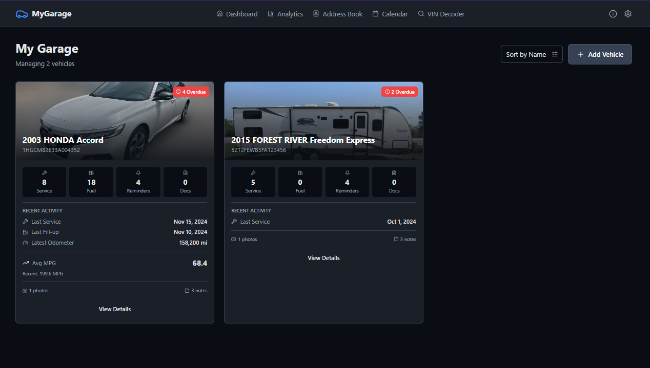 MyGarage is a self-hosted vehicle maintenance tracker. Add your cars, log services, track fuel economy, and get reminders when maintenance is due. It decodes VINs automatically, checks for recalls, and keeps all your receipts and documents in one place.