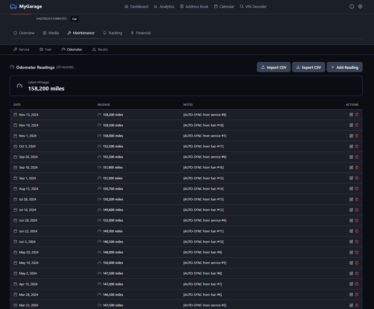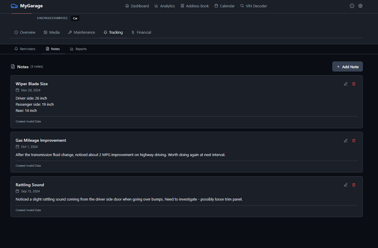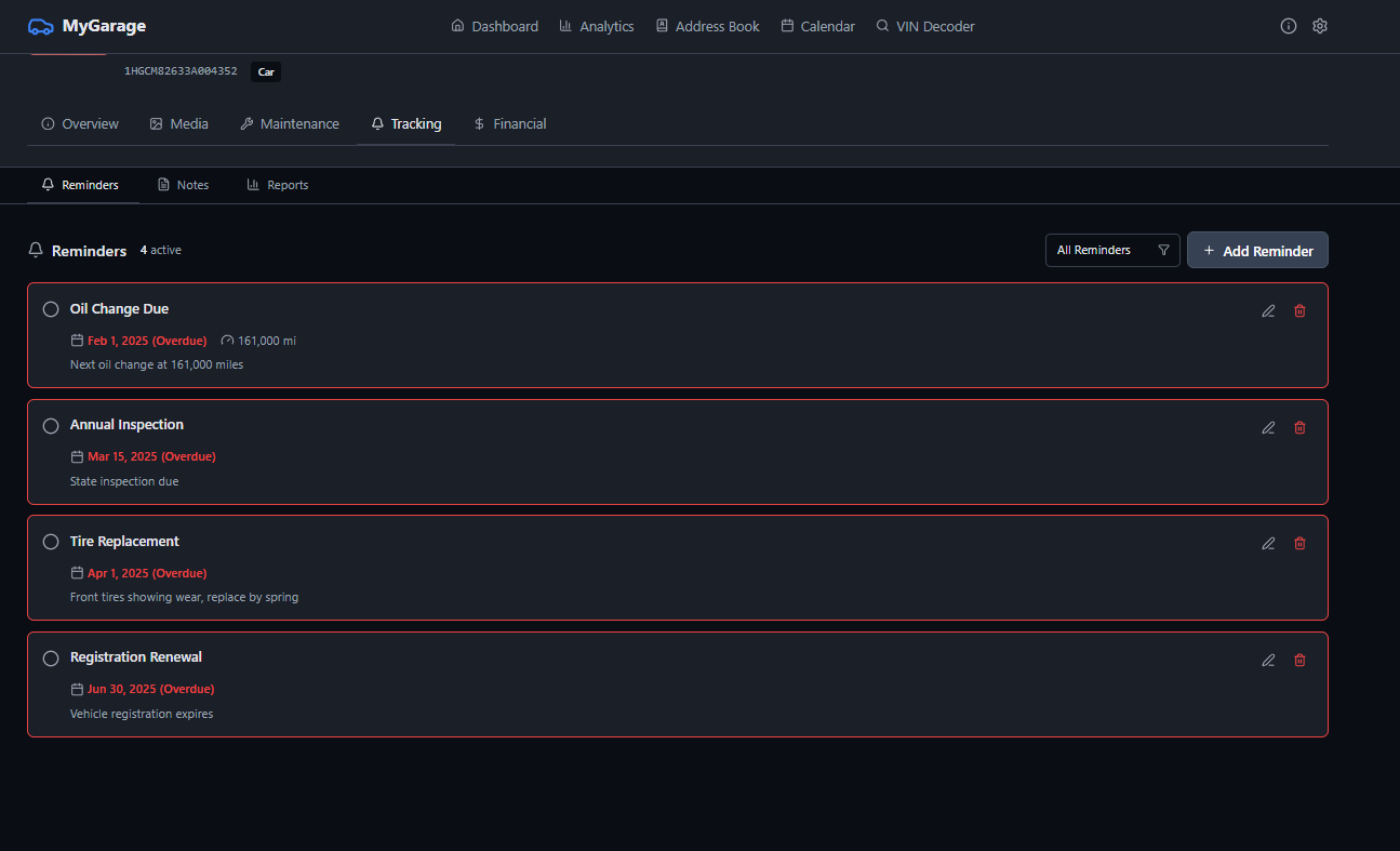 MyGarage is a self-hosted vehicle maintenance tracker. Add your cars, log services, track fuel economy, and get reminders when maintenance is due. It decodes VINs automatically, checks for recalls, and keeps all your receipts and documents in one place.