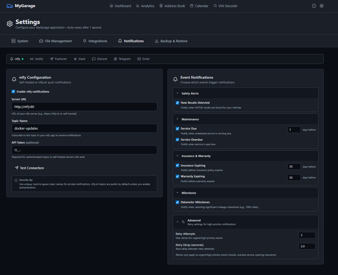 7 notification providers: ntfy, Gotify, Pushover, Slack, Discord, Telegram, and Email. Get alerts for maintenance, recalls, and expirations.