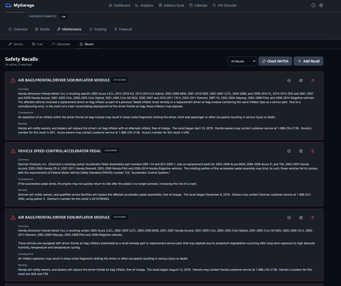 Add vehicles by VIN and get automatic decoding via NHTSA. Stores make, model, year, engine, transmission, and more.