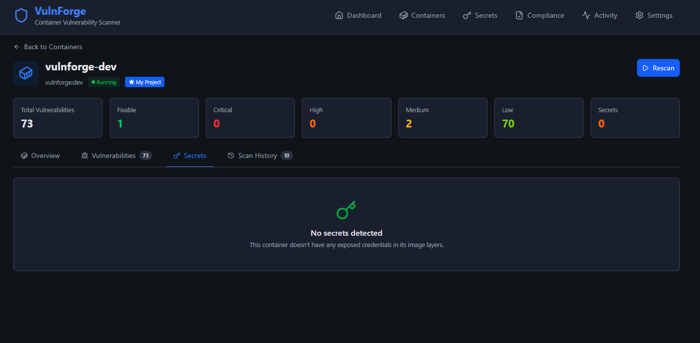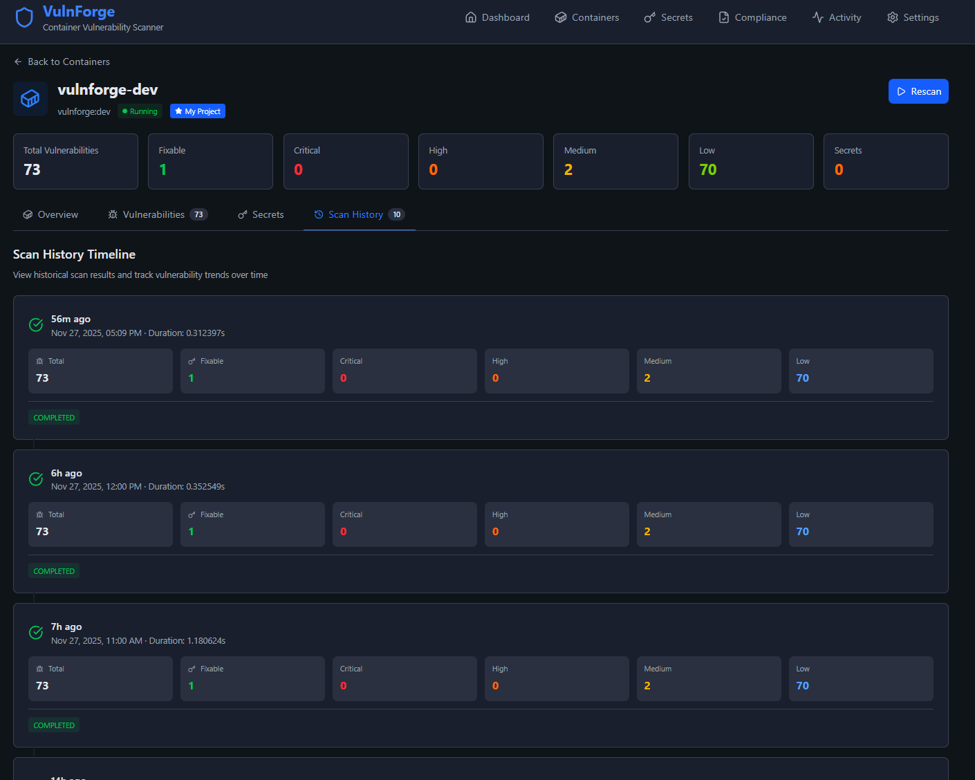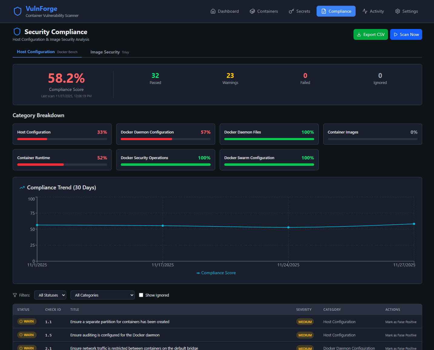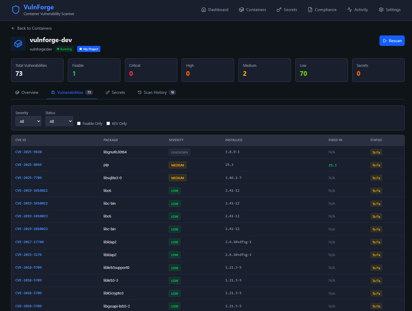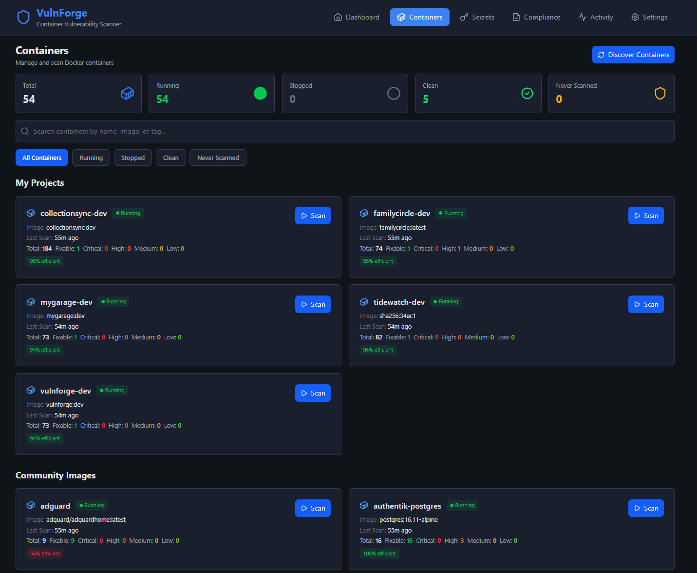 VulnForge is a self-hosted dashboard that keeps homelab operators on top of container security. It combines Trivy, Docker Bench, Dockle, and Dive to surface vulnerabilities, configuration drift, and image hygiene issues in one placeβall without relying on external SaaS services.